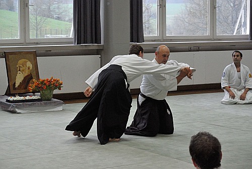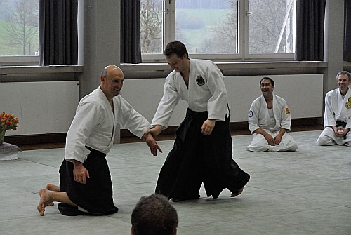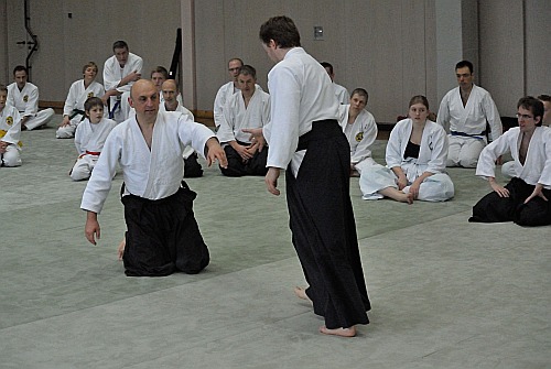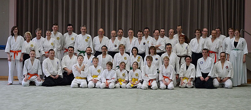 Großer AUD Lehrgang vom 20. bis 21.04.2013... ...in der Musberger Festhalle Am letzten Wochenende war es schon wieder einmal soweit. Unser alljährlicher Bundeslehrgang stand vor der Tür. Und wie jedes Mal kommen erst die Arbeit und dann das Vergnügen. Zuerst mussten am Vorabend wieder jede Menge Matten von 2 Dojos in die Musberger Festhalle transportiert werden. Schließlich war es am Samstag soweit. Zum ersten Mal konnten wir unseren Vizepräsidenten Gerhard Mai, 5. Dan, als Meister und Lehrer dieses Lehrganges begrüßen. Insgesamt nahmen rund 50 Aikidoka am 2- tägigen Lehrgang teil, vom 5. Kyu bis zum 5. Dan war alles vertreten. Besonders erfreulich ist hierbei, dass auch einige Kinder und Jugendliche den Weg ins Dojo gefunden haben. Los ging es wieder mit den ganz wichtigen Aufwärmübungen. Der Einstieg ins eigentliche Training wurde durch verschiedene Sabaki in allen möglichen Ausführungen eingeleitet. Eigentlich keine besondere Herausforderung � sollte man jedenfalls nach einigen Jahren meinen. Doch weit gefehlt! Vor allem dann, wenn die Ansage wild durcheinander folgt. Weiter ging es mit Ude-Osae aus allen erdenklichen Angriffen. Auch hier gab es wieder einige Aha-Effekte zu erleben, da die Angriffe gegenüber dem klassisch gelernten leicht abwichen. Eine Besonderheit � zumindest für die Schülergrade � ist es, wenn der Angreifer mit einem Messer bewaffnet ist. Am Sonntag ging es dann weiter. Es folgten Abwehrtechniken aus allen Schlagangriffen. Hierbei war vom "einfachen" Shiho-Nage bis zum Ude-nobashi mit und ohne Messer so ziemlich alles dabei. Ruck zuck gingen auch diese beiden Trainingsstunden vorbei und es hieß wieder "Matten abbauen und verladen". Vor der Heimreise stärkten sich die Aikidoka bei einem köstlichen Nudelpasta Büffet mit dreierlei Soßen und diversen Salaten, von Familie Krämer gekocht und perfekt ausgerichtet. Vielen Dank! Wir möchten uns an dieser Stelle noch einmal ganz herzlich bei Gerhard für das gebotene Training bedanken. Und auch hier gilt dasselbe wie nach jeder Prüfung: nach dem Lehrgang ist wieder vor dem Lehrgang! Dietmar Sauter