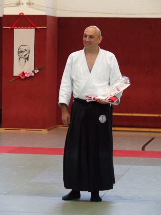 Bis zum 5. DAN Aikido werden in der Aikido Union Deutschland Prüfungen gefordert, in der die Absolventen ihre technische, persönliche und geistig-inhaltliche Reife zur Technik und Lehre des Aikido unter Beweis stellen müssen. Weitere Graduierungen werden demnach nur aufgrund außergewöhnlichen Engagements auf dem Weg des AIKI gewährt. Auf Vorschlag der Technischen Kommission des Bundesverbades, welcher die ranghöchsten Meister der Aikido-Union angehören, wurde bei der diesjährigen Hauptversammlung an der Sportschule in Bad Blankenburg (Thüringen) im August 2014 Meister Gerhard Mai auf den 6. Dan-Aikido graduiert. Der Antrag der Technischen Kommission wurde mit Gerhards langjährigen ehrenamtlichen Funktionen auf Vereins-, Landes- und Bundesebene seit nun mehr als 30 Jahren begründet. Gerhard Mai ist als ranghöchster Meister quasi die Leitfigur in der AUD und ihm obliegt die Aufgabe der Förderung und Entwicklung aller Aikido-Meister und- Funktionäre, welche er beständig und mit großartigem Einsatz erfüllt. Durch sein kompetentes und verantwortungsvolles Engagement als Lehrer, Berater und Förderer befreundeter slowenischer Aikido-Vereine, konnte sogar eine länderübergreifende Aikido-Beziehung entwickelt und gefestigt werden. Mit einstimmigem Ergebnis wurde der Antrag von allen Mitgliedern der Aikido Union Deutschland befürwortet. Im Rahmen einer Ehrungsfeier wurden dem Ehrenkandidaten vom Präsidenten der AUD die Graduierungsurkunde und ein neuer Gürtel (rot-weiß) überreicht. Diese neue Gürtelfarbe (rotweißer Gürtel = Shima-obi) symbolisiert im japanischen Graduierungs-System den Grad des Wissens, der nach den schwarzen Gürtelstufen (perfektionierte Technik und rechte innere Haltung) das Streben nach dem höchstmöglichen Ideal und der geistigen Perfektion bedeutet. Wir gratulieren Gerhard Mai zu dieser verdienten Auszeichnung!