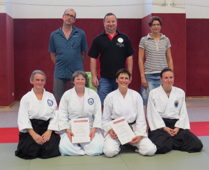 Erfolgreiche Dan-Prüfungen in Bad Blankenburg 2015 Während des Wochenlehrgangs der Aikido Union Deutschland e.V. in der LSS Bad Blankenburg in Thüringen legten unter anderen auch zwei Aikidoka aus Süd-Deutschland erfolgreich die Prüfung zum ersten und zum zweiten Dan ab. Das während der ersten Wochenhälfte durchgeführte Fach Überprüfung, bei dem die Anwärter in den Techniken bis zu ihrer Graduierung bewertet wurden, stellte sicherlich für alle eine besondere Herausforderung dar. Nachdem die Prüfungskommission, bestehend aus Manfred Tretter, Joachim Vietzen und Daniela Krauss (alle 3.Dan), mit den dargebotenen Leistungen zufrieden war, fanden dann am Mittwochabend die Prüfungen zum ersten Dan mit der 1.Kata, den Nage-Waza (Wurftechniken) und dem Randori statt.