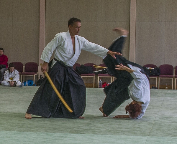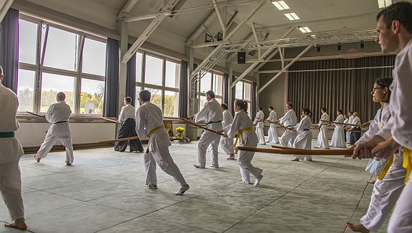 Der Schwerpunkt der ersten Trainingseinheit bestand darin, besondere Achtsamkeit auf die Gewichtsverlagerung und das Gleichgewicht während der gesamten Technik zu legen. Ausweichen, Umleiten, Seitenwechsel und dann Abschließen, das Ganze teilweise mit dem Bokken (Holzschwert), so dass wir wortwörtlich über die Klinge springen mussten. ![]() An unserem Buffet, mit Kaffee, Tee, Kuchen und weiteren Leckereien konnten die Aikidoka wieder Energie auftanken, sowie Ihren Wasserhaushalt ins Gleichgewicht bringen. Nachdem wir uns verschiedenen Armhebeln "hingaben" und versuchten, den Angriff unseres Partners zu antizipieren, merkten wir gar nicht, dass die Zeit wie im Fluge verging und die Trainingseinheit um 50 % aufgestockt wurde - wenn dies mal nicht ein optimales Preis- Leistungsverhältnis ergibt ... Anschließend trafen sich die meisten Aikidoka zum Abendessen in der Vereinsgaststätte Hirschgraben. Am Sonntag Vormittag, waren wieder über 30 Aikidoka auf der Matte und erlebten altbekannte Techniken auf neue Art - und zwar mit dem Bokken ausgeführt. So bekamen wir neue Eindrücke bei der Durchführung der Technik und einen Einblick in den Ursprung der Techniken. Das Führen des Bokken erfordert mehr Aufmerksamkeit beim Bewegungsablauf, den sicheren Stand und der Fußstellung vom Anfang bis zum Ende. ![]() Zum Abschluss dieses Wochenend-Lehrganges in Musberg gab es noch ein reichhaltiges Mittagsbuffet, so dass alle gestärkt die Heimreise antreten konnten. Wir bedanken uns herzlich beim Lehrer Peter Hintz und den teilnehmenden Aikidoka sowie bei allen, die dazu beigetragen haben, dass auch der diesjährige Lehrgang ein unvergessliches Erlebnis wurde. Bericht von Paul ![]()