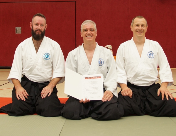 Erfolgreiche Dan-Prüfung beim diesjährigen Wochenlehrgang in Bad Blankenburg Am Ende des Wochenlehrgangs in der LSS Bad Blankenburg stellte sich Dieter Ade vom AC Ostfildern der Prüfung zum 2.Dan. Mit der gültigen Lizenz eines Dan-Theorielehrgangs waren auch alle Voraussetzungen zur Prüfungsteilnahme erfüllt. Im Fach Überprüfung waren von der 3-köpfigen Prüfungskommission (bestehend aus Daniela Krauß, Stephan Hopf und Joachim Vietzen) die 1.Kata sowie diverse Techniken aus dem Kyu-Programm und dem Programm zum 1.Dan gefordert. Danach folgten das Fach Aiki-no-Kata mit der 2.Kata (Form im Kniesitz), Hanmi-hantachi (Techniken im Kniestand), Aiki-Jo-Jitsu (Stabtechniken) und zuletzt Randori. Da Dieter der einzige Prüfling war, achteten die Prüfer auf angemessene Pausen zwischen den Prüfungsfächern. Dieter lieferte in allen Fächern gute bis sehr gute Leistungen ab und wurde mit der Übergabe der Urkunde zum 2.Dan Aikido belohnt. Im Namen der Aikido-Union Deutschland e.V. und im Namen der Prüfer gratuliere ich Dieter Ade ganz herzlich.