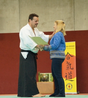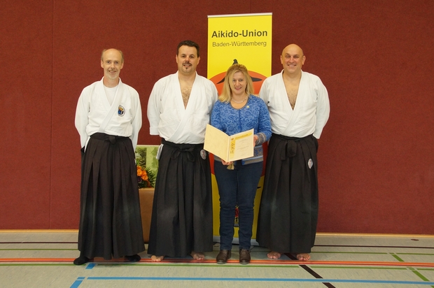Für Ihre langjährige ehrenamtliche Tätigkeit nicht nur auf Verbands- sondern vor allem auch auf Vereinsebene wurde Sportfreundin Andrea Schwab-Mai die Ehrennadel der AUBW in Gold verliehen. Im Rahmen des diesjährigen Sektionslehrgangs in Biberach übergab Christoph Bell (1.Vorsitzender der AUBW) nach einer kurzen Rede unter großem Beifall Urkunde, Ehrennadel und ein kleines Präsent.