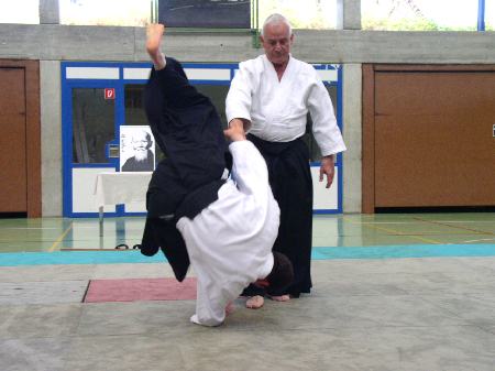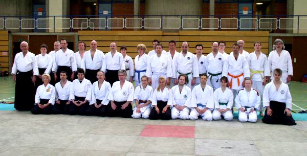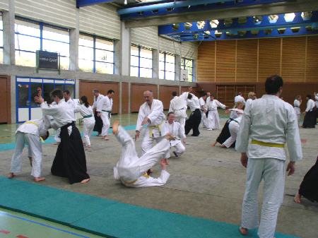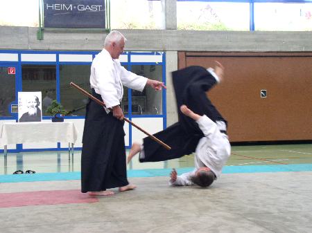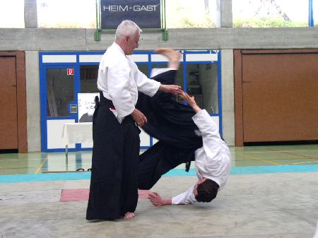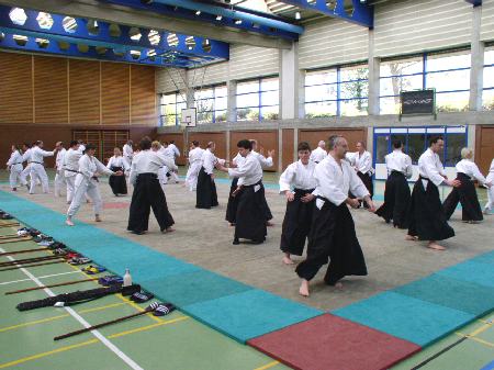 am Samstag und Sonntag den 16./17. April 2005 in Geislingen: Am 16. und 17.04.2005 konnte die Aikidoabteilung bereits zum dritten Mal einen Landeslehrgang im Rahmen des Lehrgangplanes der AUBW ausrichten. Nach anstrengender Vorbereitung, wir konnten erst am Samstag ab 12 Uhr in die Halle, und hektischem Aufbau sind wir doch noch rechtzeitig fertig geworden und konnten den Lehrgang beginnen lassen. Einen großen Dank an alle die mitgeholfen haben beim Mattentransport und Aufbau. So konnten wir 42 Aikidokas in Geislingen begrüßen die aus ganz Württemberg und sogar aus Slowenien angereist waren, um bei Meister Erhard Altenbrandt zu trainieren. Nach einer kurzen Ansprache konnten wir dann auch gleich mit einer lockeren Aufwärmgymnastik beginnen .Meister Erhard hatte sich diesmal vorgenommen, uns die Grundschule zu vermitteln, da überwiegend untere Kyugrade gemeldet haben (was den Meistern und Meisterinnen aber durchaus auch gut tut, denn sie wollen sich genauso verbessern). Den Anfang machten Zentrumsübungen damit auch in der Technik ein sicherer Stand vorhanden ist (was aber vielen sehr schwer gefallen ist). Die Fallschule wurde natürlich an vielen verschiedenen Beispielen ausgiebig geübt, da sie ein sehr wichtiger Bestandteil des Aikidos ist. Danach durften wir uns an einer Schlüsseltechnik des Aikidos -dem Irimi Nage- austoben, den Meister Erhard mit einer schon fast spielerischen Leichtigkeit vorzeigte. Denn der Irimi Nage vereint alle Prinzipien des Aikido (gute Sabaki Bewegung, sicherer Stand, gleichmäßige Ausführung, locker bleiben - nicht verkrampfen,...) Nach der Wurftechnik wurde dann natürlich auch die Bodenhaltetechnik nicht vergessen, wo wir den Ude Osai üben konnten, natürlich unter Einhaltung der Prinzipien des Aikidos. Nachdem die zwei Übungsstunden viel zu schnell vorbei waren sind wir fast schon traditionell beim Italiener eingekehrt, wo der anstrengende Tag gemütlich ausgeklungen ist. Am Sonntag wurde dann mit dem Stab geübt, was immer ein Highlight ist, wenn man sieht, wie Meister Erhard mit diesem umgeht. Für die oberen Kyugrade wurde zum Abschluss noch der Tenchi Nage geübt, der die unteren Gurtgrade vor große Probleme stellte, die aber alle gelöst werden konnten. Nachdem Meister Erhard mit einem kleinen Geschenk belohnt wurde und die Matten wieder aufgeräumt waren, konnten wir den Sonntagvormittag bei Kaffee und Kuchen ausklingen lassen. Ich bedanke mich bei meinem Lehrer Meister Erhard Altenbrandt für die tolle Leitung des Lehrganges, bei allen die am Lehrgang teilgenommen haben und natürlich bei allen Helfern, ohne die ein solcher Lehrgang nicht durchzuführen ist. Vielen Dank und bis nächstes Jahr...
