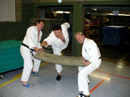 zu erweitern, bzw. zu erwerben. Das Süddeutsche Team, bestehend aus Gerhard Mai (4. Dan), Konrad Hugger (4. Dan) und Jürgen Weithofer (2. Dan), gab sich merklich große Mühe mit der Recherche und der Vorbereitung der einzelnen Themen und Vorträge. Am Freitag Abend begann es mit theoretischen Themen wie die Historie des Aikido, also die Biographie Morihei Ueshibas und die geschichtliche Entwicklung des Aikido, und dem Prüfungswesen. Abgehalten wurden die theoretischen Teile in einem Schulungsraum des DRK Geislingen, die praktischen in der nahen Schulturnhalle. Anschließend ging es in die Pizzeria zum Abendessen, wobei mancher merken musste, wo die Grenzen des Scharf- Essens liegen. Danach fuhren manche Teilnehmer nach Hause, die Auswärtigen wurden privat untergebracht. Am Samstag Früh traf man sich ausgeruht und in aller Frische und weiter ging es mit den Themen der Übungsleiter, Allgemeine Grundlagen des klassischen Aikido. Eine kurze Pause mit einem zweiten Frühstück und fließendem Kaffee brachte auch die Morgenmuffel in Schwung. Anschließend ging es weiter mit den Trainingsmethoden und schon gab es wieder etwas zum Essen. Mittagessen! Superleckere belegte Wecken wurden kredenzt und spontan wurde auch für die 20% Vegetarier Nahrung gezaubert. Weiter ging es danach mit dem Thema Methodik des Aikido-Unterrichts. Dabei wurden in Gruppenarbeiten, a 2-3 Personen, Idealkonzepte für Trainingseinheiten Technik, Aiki-no-Kata und Randori bzw. Jiyu- Waza entwickelt und vorgetragen. Dann wurden ideale Unterrichtsstunden für Jugendgruppen, Erwachsenengruppen und heterogene Alters- und Leistungsgruppen ausgearbeitet, wobei zusätzliche Fragen zum Ablauf, den gestellten Anforderungen und den jeweiligen Unterschieden sehr individuell bearbeitet wurden. Dann noch "schnell" eine Unterrichtsstunde geplant und vorgestellt, und ab ging es in die Halle zum Verwirklichen. Da man nach anfänglich etwas unplanmäßig länger dauernden Themen immer mehr Zeit durch verkürzte Pausen wieder gut gemacht hatte, konnte man nun entspannt und planmäßig den Theorie-Lehrgang beenden. Die von allen Teilnehmern erworbene Qualifizierung ist bis zum Ende des dritten Jahres nach ihrem Erwerb, also bis Ende 2009, gültig. Super waren der fließende Kaffee und das Nahrungsangebot in den Pausen, tausendmal Danke! Ich kann nur sagen, es war eine wirklich gute Atmosphäre und die vielleicht etwas trockenen Themen waren so interessant, dass sie nicht als solche empfunden wurden.