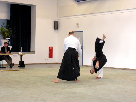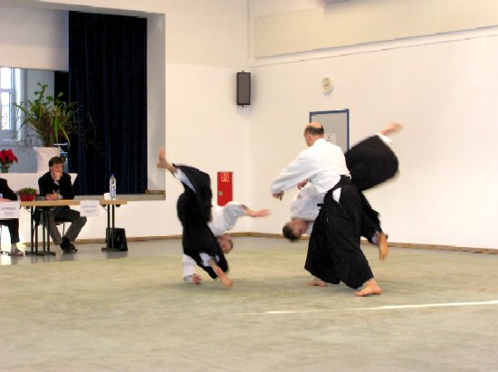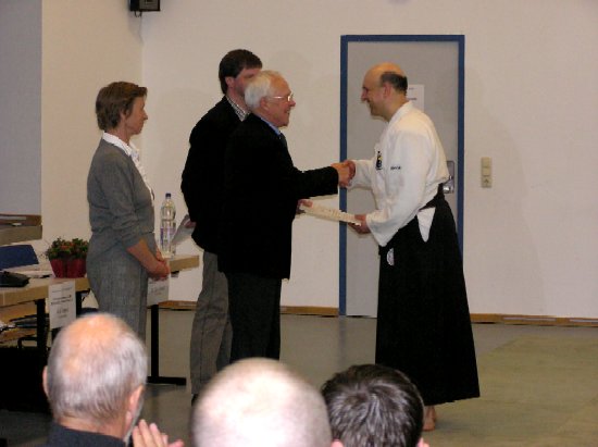 zu diesem Meisterstück! Der Weg entsteht, indem man ihn geht Wenn man dann noch den Weg des Aiki stetig über so viele Jahre hinweg geht und sich trotz teilweise härtester Bedingungen weder davon abbringen, noch sein generell positives Bild vom Mitmenschen negativ beeinflussen läßt, wenn man Verantwortung übernimmt, lebt und ausfüllt, wenn man die positiven Inhalte in Familie, Beruf und Umfeld überträgt, wenn man in Konflikten defensives Prinzip und Verhältnismäßigkeit bewahrt, wenn man dadurch - obwohl noch jung an Jahren - reift und sich entwickelt, wenn sich auch diese Erkenntnisse immer wieder ins Ganze einfügen und sich der Horizont erweitert → dann heißt man Gerhard Mai und zeigt eine Prüfung zum 5. Dan, die mit stehendem Spontan-Applaus der überaus zahlreich anwesenden Zuschauer geendet hat. Es war eine Prüfung, die, wie vieles im Aikido, mit Worten schwer zu beschreiben ist. Begnadetes Timing, Spontaneität, Ki, Freude an der Bewegung, inneres Feuer und Eleganz verband sich in den Formen von Gerhard zu einem Ganzen, das immer wieder zu atemloser Stille im gut gefüllten Dojo führte. Die AUBW kann sich glücklich schätzen, einen solch fähigen und gleichzeitig menschlich so angenehmen Sensei in ihren Reihen zu haben. Konrad Hugger(1. Vorsitzender der AUBW)