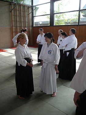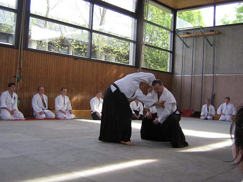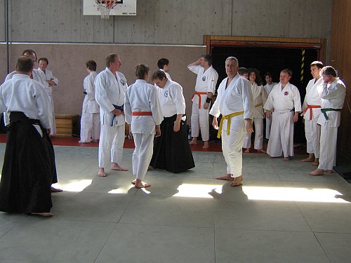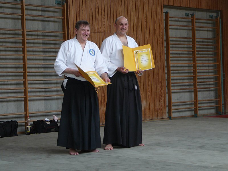 Im Rahmen des Dan-Vorbereitungslehrgangs am 26.04.09 in Ostfildern wurden Konrad Hugger und Gerhard Mai für ihr herausragendes Engagement für die Aikido-Union Baden-Württemberg geehrt. Am 25.04. und 26.04.09 fand das 2. zentrale Training der Aikido-Union Baden-Württemberg (AUBW) in Ostfildern statt und stieß erneut auf eine sehr gute Resonanz. Das Landes-Kyu-Training am Samstag bestritt wieder Manfred Tretter (3. Dan) in mittlerweile bewährter Manier und brachte die Anwesenden ordentlich zum Schwitzen. Nach einigen komplexen Kokyo-nage-Techniken, die insbesondere die unteren Schülergrade teils an den Rand der Verzweiflung brachten, leitete er über zu Grundtechniken, die entsprechend der Graduierungen trainiert wurden. So nahm jeder seinen persönlichen Fortschritt an diesem Tag mit nach Hause. Der Sonntag verlief vom Trainingsablauf her gesehen etwas ruhiger, jedoch nicht weniger schweißtreibend, stand doch im Rahmen dieses Dan-Vorbereitungstrainings das Üben der verschiedenen Katas auf dem Programm. Konrad Hugger (4. Dan) und Gerhard Mai (5. Dan) teilten sich die "Arbeit" und vermittelten die Techniken wie gewohnt sehr anschaulich. Im Anschluss an das Training verlieh die AUBW Konrad und Gerhard für ihre Verdienste und langjährige Unterstützung die Ehrennadel der AUBW in Bronze. So fand ein sehr schönes Training am Sonntagmittag seinen würdigen Abschluss und Kaffee und Kuchen schmeckten noch mal so gut wie sonst.
