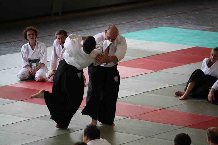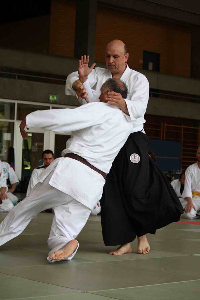 Riesige Resonanz beim ersten Landeslehrgang der Aikido-Union Baden-Württemberg in Göppingen Der Aikido-Club Göppingen richtete am 27. und 28. Juni 2009 zum ersten Mal einen Landeslehrgang der Aikido-Union Baden-Württemberg in Göppingen aus und landete dabei gleich einen Volltreffer. Die Veranstaltung erwies sich als einer der größten Lehrgänge in der Geschichte des Verbandes. 55 Aikidokas aus Bachtal, Böhmenkirch, Bronnen, Geislingen, Ostfildern, Sallneck, Stuttgart, Ulm und natürlich Göppingen ließen sich die Gelegenheit nicht entgehen, sich zwei Tage lang von einem der höchstgraduierten Aikido-Meister der Aikido-Union Deutschland, Gerhard Mai, 5. Dan, in der Turnhalle der Bereitschaftspolizei Göppingen in dieser japanischen Kampfkunst unterweisen zu lassen. Aufgrund der vielen Anmeldungen war für den Aikido-Club Göppingen jedoch schnell klar, dass die vor Ort vorhandenen Trainingsmatten für den Lehrgang nicht ausreichen würden. Aber Dank der Hilfe des Vereins in Böhmenkirch und mit Unterstützung durch einen LKW von Alexander Kirchgessner, Creative Gestaltung, war es möglich, die benötigten zusätzlichen Matten zu besorgen. Somit konnten sich dann die angereisten Aikidokas aller Altersgruppen, darunter 15 Dan-Träger und immerhin knapp ein Viertel Frauen, von Meister Gerhard Mai bei der Vervollkommnung der unterschiedlichsten Wurf- und Haltetechniken in dieser Kampfkunst anleiten lassen. Insbesondere der zweite Trainingstag war dann - zur Herausforderung aller - der Einweisung in verschiedene Waffentechniken (Holzstab und Holzmesser) gewidmet. Nach zwei anstrengenden Tagen waren sich die rundum zufriedenen Teilnehmerinnen und Teilnehmer beim Abschied alle einig: "Zum nächsten Landeslehrgang beim Aikido-Club in Göppingen kommen wir wieder". Bilder vom Lehrgang und nähere Informationen zum Aikido-Club Göppingen unter www.aikido-club-goeppingen.de. Für Interessierte ist ein Probetraining jederzeit möglich.