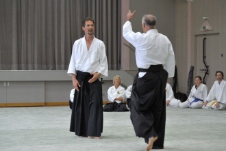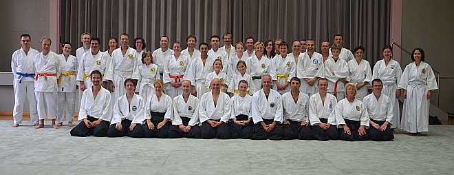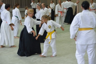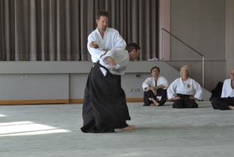 An diesem Datum fand unser diesjähriger AUD- Lehrgang in der Festhalle statt. Als Trainer konnten wir den AUD Präsidenten, Stephan Gronostay, 5. Dan Aikido gewinnen. Im Vorfeld hatten wir über 40 Anmeldungen von befreundeten Vereinen der AUD- Union erhalten. Und mit unseren eigenen Mitgliedern war die Matte an beiden Tagen mit ca. 50 Aikidoka dementsprechend voll. Nach der Begrüßung durch ISI begann Stephan mit dem überaus wichtigen Aufwärmen und anschließend ging es dann auch zur Sache mit einfachen Vorübungen durch verschiedene Sabaki in diversen Ausführungen. Darauf folgte dann der Irimi- Nage aus verschiedenen Angriffen. Stephan führte uns die "Feinheiten" sehr gut vor Augen. Danach durften wir uns am Kaiten- Nage Uchi und Kaiten- Nage Soto probieren. Durch den ständigen Partnerwechsel bekamen wir die Gelegenheit, als Schüler mal mit einem Meister zu üben. Hier wird einem dann doch ganz schnell der Unterschied in der Ausführung bewusst - eben diese kleinen "Feinheiten", auf die uns Stephan immer wieder hinwiesen hat. Es ist auch nach einigen Jahren Übung immer wieder erstaunlich, wie schwierig es doch ist, das eben vom Meister gezeigte möglichst genauso umzusetzen. Als Schüler wird einem so schnell klar, dass es ein weiter Weg vom Schüler bis zum Meister ist. Aber das ist ja auch gut so.