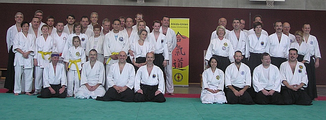 Erfolgreicher Sektionslehrgang und Jubiläumsfeier der AUBW (02.11.-04.11.2012) Zum dritten Mal wurde der Sektionslehrgang der Aikido Union Baden-Württemberg (AUBW) in Biberach an der Riß abgehalten: eine gute Entscheidung. Denn wieder konnten wir in der schönen Turnhalle des Wieland-Gymnasiums trainieren auf guten Budo-Matten, die uns Peter Milotzke (Budo-Abteilungsleiter des TG Biberach) zur Verfügung stellte: herzlichen Dank hierfür. Lehrgangsleiter Harald Gallenmüller begrüßte uns alle recht herzlich und freute sich, dass wir mit 43 teilnehmenden Aikidoka eine hohe Akzeptanz dieses Lehrgangs ausdrücken. Das ist sicher auch der guten Organisation und Betreuung zuzuschreiben. Hierfür ein herzliches Dankeschön. Unsere Lehrer für dieses Wochenende waren Meister Gerhard Mai (5. Dan) und Meisterin Andrea Schwab-Mai (4. Dan), die uns bei allen Trainings-Einheiten mit viel Freude und hohem Engagement anleiteten. Das Freitags- und Sonntags-Training war ganz im Zeichen des gemeinsamen Übens geprägt � Kyu- und Dan-Grade durften frei durchmischen und lernten so nebenbei die Aikidoka aus den anderen Dojos kennen. Die beiden Trainingseinheiten am Samstag zeigten uns Techniken außerhalb der Prüfungsordnung, die mit viel Konzentration und gleichzeitigem Spaß an der Bewegung geübt wurden. Stab- und Messertechniken bei den Dan-Graden und auch bei den Kyu-Graden ergänzten die gezeigten Techniken. An dieser Stelle möchten wir uns ganz herzlich bei Meister Gerhard und Meisterin Andrea bedanken � es war einfach toll! Nach dem Freitags-Training lud uns Dr. Stephan Gronostay (5. Dan), Präsident der Aikido-Union Deutschland, im Anschluss zu einem kleinen Umtrunk ein, seinen Geburtstag zu feiern. Ein gemeinsames Abendessen im Ebersbacher Hof rundete diesen Tag ab. Doch wir hatten noch mehr zu feiern: am Samstagabend trafen wir uns zu einem Sektempfang der AUBW, denn Christoph Bell (1. Vorsitzende) und Andrea Schwab-Mai (2. Vorsitzende) luden zur Jubiläumsfeier ein: 10 Jahre AUBW! In seiner Rede dankte Christoph Bell seinen Vorgängern im Vorstand und würdigte das hohe Engagement. Das Jubiläum war auch ein Anlass für die Ehrung besonders verdienter Vorstandsmitglieder. Anne Gaschler (Landes-Schatzmeisterin) und Stephan Hopf (Referent für Öffentlichkeitsarbeit) wurden mit der bronzenen Ehren-Nadel der AUBW für ihr langjähriges Wirken geehrt. Das anschließende Festessen wurde mit einem kleinen Geschenk für jeden zum verfrühten Weihnachtsfest.