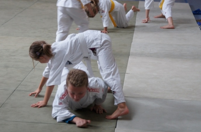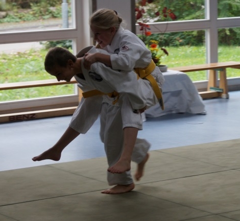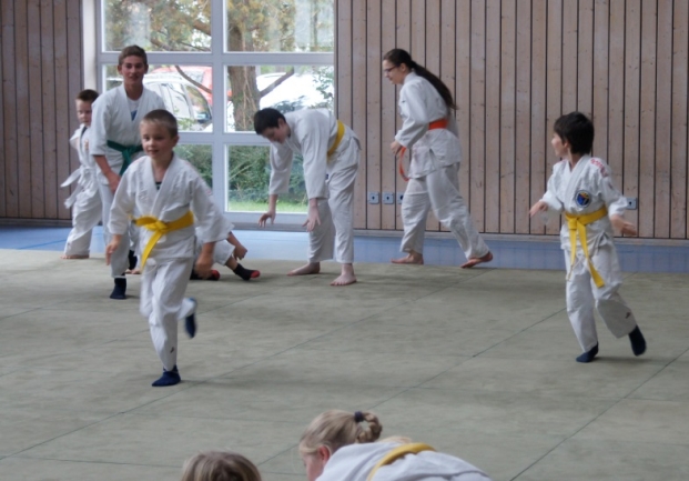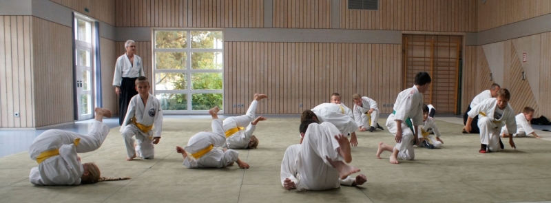 Jede Menge Spiel und Spaß - und nebenbei lernt man noch was ... und zwar beim Kinder-Jugendlehrgang der AUBW Anfang Oktober in Bronnen. Das Lehrerduo Thorsten und Dieter vom Aikido-Club Ostfildern, mittlerweile richtig routiniert am Werk, brachte die junge Schar schon anfangs mit fetzigen Aufwärmspielen auf Touren. Grundschule und Fallschule gehörten natürlich zum Pflichtprogramm. Danach gab�s den Einstieg in den Irimi-Nage und später noch in die schwierigen rückwärtigen Angriffe. Ushiro-Ryokata-tori zum Bodenhaltehebel war dann die echte Herausforderung für so manchen jungen Aikidoka. Dieter und Thorsten gaben aber die nötige methodische und didaktische Hilfestellung, so dass alle ihre Erfolgserlebnisse hatten. Die Bronnener Ausrichterriege hatte mal wieder alles aufgefahren, was das Herz begehrt: Kaffee- und Kuchentheke, Obst in allen Farben und zum Schluss noch Leberkäs-Semmel. Herzlichen Dank an alle, die den Lehrgang zu einem Rundum-Wohlfühlpaket werden ließen: Dieter und Thorsten als überzeugende Lehrer mit Spaß und Herz bei der Sache und Harald mit seiner Truppe im Einsatz als Verpflegungskünstler! Hoffentlich dürfen wir nächstes Jahr wieder kommen. Andrea Schwab-Mai |