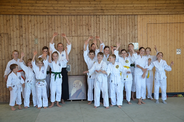 Sechster Kinder und Jugendlehrgang am 13. Oktober in Musberg Alle Jahre wieder richten wir in unserem Dojo einen Kinder- und Jugendlehrgang aus. Hierzu laden wir auch die befreundeten Vereine der Aikido-Union Baden-Württemberg ein. Insgesamt durften wir an diesem schönen Samstagnachmittag 16 junge Aikidoka bei uns auf der Matte begrüßen. Vertreten waren Kids vom 6. Kyu (weiß) bis zum 3. Kyu (grün). Als Trainer konnten wir Alexander Stock und Thorsten Rieger � beide 2. Dan � gewinnen. Als erstes gab es natürlich ausgiebige Dehnungs- und Aufwärmübungen. Schließlich wollen wir nicht, dass es zu Verletzungen auf Grund kalter Muskulatur kommt. Auf einem Lehrgang werden meistens auch Techniken gezeigt, von denen die Übenden noch äweit entfernt� sind. Daher ging es auch gleich richtig zur Sache. Alexander und Thorsten zeigten unter anderem einen Kokyu-Nage aus Ryote-tori und aus dem rückwärtigen Angriff Ushiro-kakae-tori. Hierbei handelt es sich um eine Übung auf den 1. Dan. Doch damit nicht genug. Es ging dann weiter mit Ude-Kime-Nage aus Ai-hanmi. Diese Technik steht erst auf den 2. Dan auf dem Programm. Selbst einen fortgeschrittenen Schüler stellt dies vor große Herausforderungen. Die Kids und Jugendlichen waren mit Eifer beim Üben. Selbstverständlich wurde der Lehrgang mit einer Trinkpause und zwischendurch immer mit kleinen Spielen aufgelockert. Es gab aber auch Techniken, die den Übenden durchaus vertraut sind. Der Shiho-Nage � dies ist eine der ersten Wurftechniken, die die Schüler lernen � wurde auch gezeigt. Allerdings hatte der Angreifer hierbei ein symbolisches Messer in der Hand! Zum Abschluss wurde dann noch "Rüben ziehen" gespielt. Und Null Komma nichts waren die beiden Stunden vorbei. Zum krönenden Abschluss gab es wieder traditionell Pizza und Getränke für alle. Ganz besonders bedanken dürfen wir uns bei Alexander und Thorsten, die sich extra den Nachmittag äfreigenommen� haben, um zu uns zu kommen und das Training zu leiten. Und wie immer heißt es auch dieses Jahr wieder: nach dem Lehrgang ist vor dem Lehrgang....... Bis zum nächsten Jahr. Bericht von Dietmar Sauter |