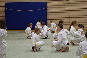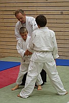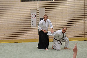 Zu aller erst möchte ich mich nochmals bei Sonja und ihrem Team für die Ausrichtung des Lehrgangs bedanken. Mein Dank auch an die Eltern, Jugendtrainer und Abteilungsleiter welche die Kinder entweder mit dem Auto oder dem Zug zum Lehrgang gebracht haben. Um 16 Uhr stellten sich Rainer Valentin und Markus Winkler den angereisten Aikido Kids. Nach der offiziellen Begrüßung ging es mit einem kurzen Aufwärmtraining weiter. Die 21 angereisten Kinder und Jugendlichen folgten gespannt den Ausführungen der beiden Trainer. Nach mehrmaligem Vormachen durften die Kids es selber versuchen, und wie immer auf Lehrgängen ( die Erwachsenen sind da auch nicht besser ) gab es ungefähr gefühlte 50 Variationen derselben Technik. Mit viel Geduld und Ruhe verbesserten Rainer und Markus die Techniken der Kinder. Nach einer kurzen Trinkpause und einem Spiel ging es zur nächsten Technik. Die beiden animierten die Kinder dazu sich regelmäßig neue Partner zu suchen was auch sehr gut funktionierte, denn die meisten der angereisten Kids kannten sich schon von früheren Lehrgängen und Camps. Die zwei Lehrgangsstunden die mit Training, kleinen Auflockerungsspielen und kurzen Pausen durchgeführt wurden vergingen sehr schnell. Ich glaube wenn es nach den Kindern gegangen wäre, hätte man vielleicht auch etwas länger trainieren können.