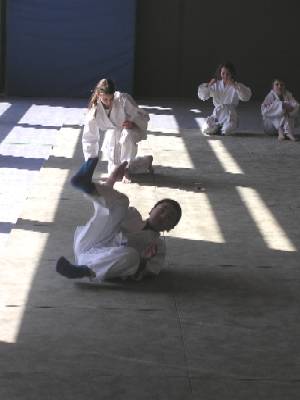 | Und wenn man selbst aus dem Gleichgewicht gebracht wird, dann lernt man vorsorglich die Fallschule, damit man verletzungsfrei alle Aikido-Techniken üben kann. Wir beginnen mit Ushiro Ukemi (= Rückwärtsrolle)! |