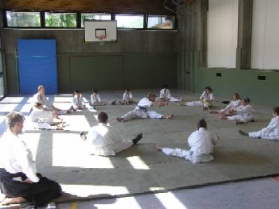 | Geübt wird im Dojo, der Trainingsraum für Aikidoka. Meist sind dies Schulsporthallen in denen die Tatamis (= Bodenmatten) ausgelegt werden. |
